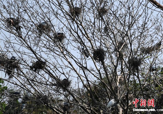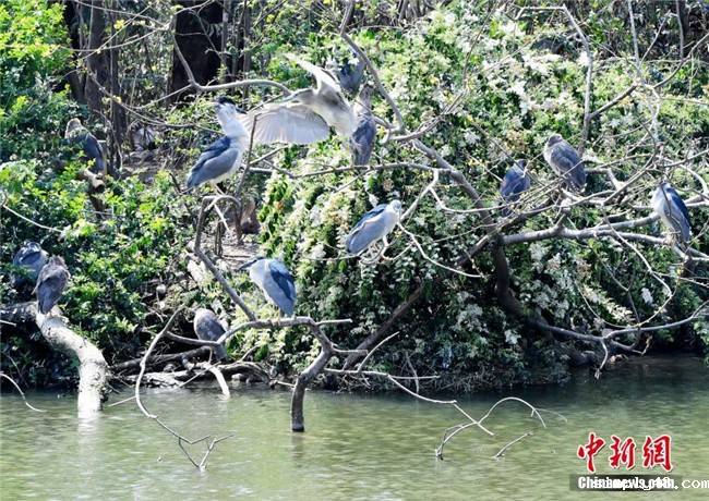 校园湖心岛上,鹭鸟在枝头嬉戏。