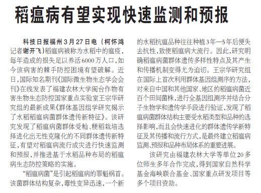 “稻瘟病菌”是引起稻瘟病的罪魁祸首。该菌群体结构复杂,毒性变异迅速,一个新的水稻抗瘟品种往往种植3年—5年后便失去抗性,致使稻瘟病大流行。因此,研究明确稻瘟病菌群体遗传多样性特点及其产生和传播机制变得尤为迫切。王宗华研究组在国际上首次利用群体基因组测序的方法,对来自中国和其他国家、地区的稻瘟病菌近百个田间菌株,进行全基因组测序并结合分子生物学和遗传学手段进行验证,发现了稻瘟病菌群体结构主要受水稻类型和品种的选择影响,而且会快速进化的群体遗传学新特征及其传播和流行方式,是最终建立稻瘟病监测、预报和品种布局体系的重要进展。