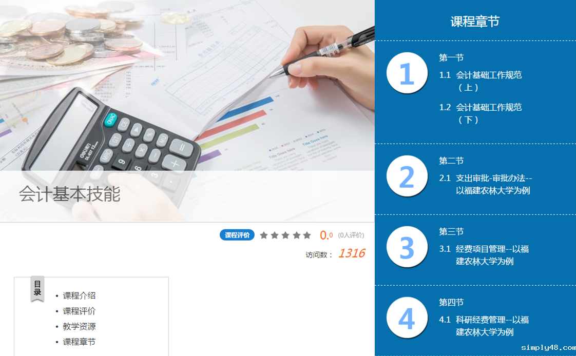 《会计基本技能》课程负责人是黄振胜,主讲老师包括由计财处业务骨干以及管理学院教师,课程内容包括:会计基础工作规范、会计档案管理、会计审核规范、行政事业单位相关财经制度在实务中的应用等,共十二个课件视频,涉及17项业务内容。