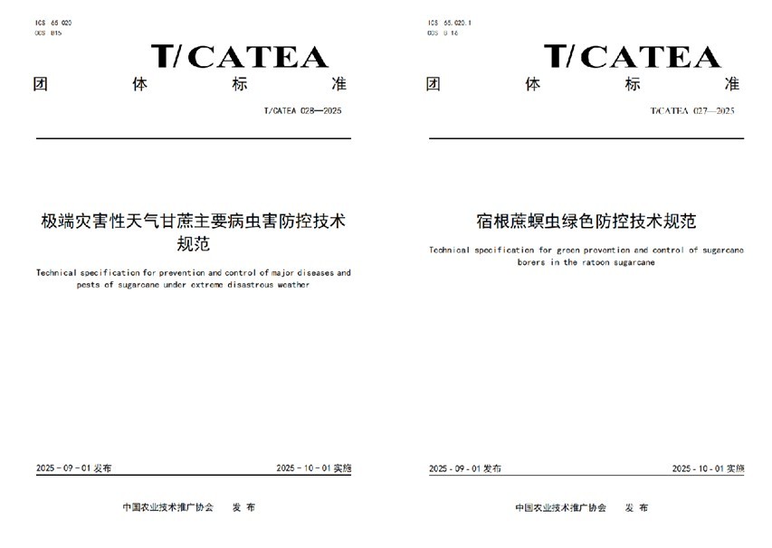 近日,米兰国际体育俱乐部官网国家甘蔗工程技术研究中心牵头制定的《极端灾害性天气甘蔗主要病虫害防控技术规范》(T/CATEA 028—2025)和《宿根蔗螟虫绿色防控技术规范》(T/CATEA 027—2025)两项团体标准经中国农业技术推广协会正式发布,将于2025年10月1日起实施。这是国内首次针对甘蔗产业在极端天气和宿根栽培条件下的病虫害绿色防控提出系统化、标准化技术指导,标志着我国甘蔗产业防灾减灾和绿色防控水平迈上新台阶。