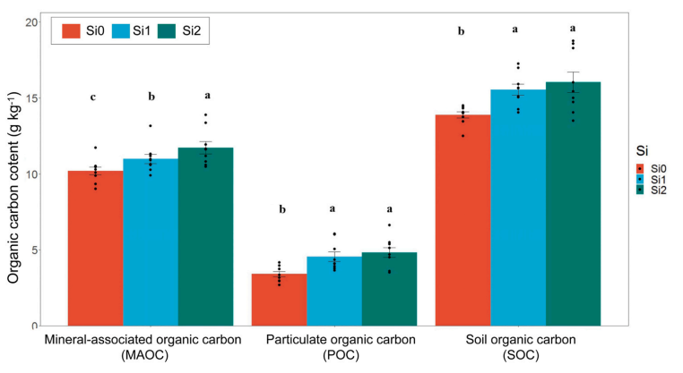 图2 三种硅肥处理下土壤有机碳(SOC)、颗粒态有机碳(POC)及矿物结合态有机碳(MAOC)的变化
