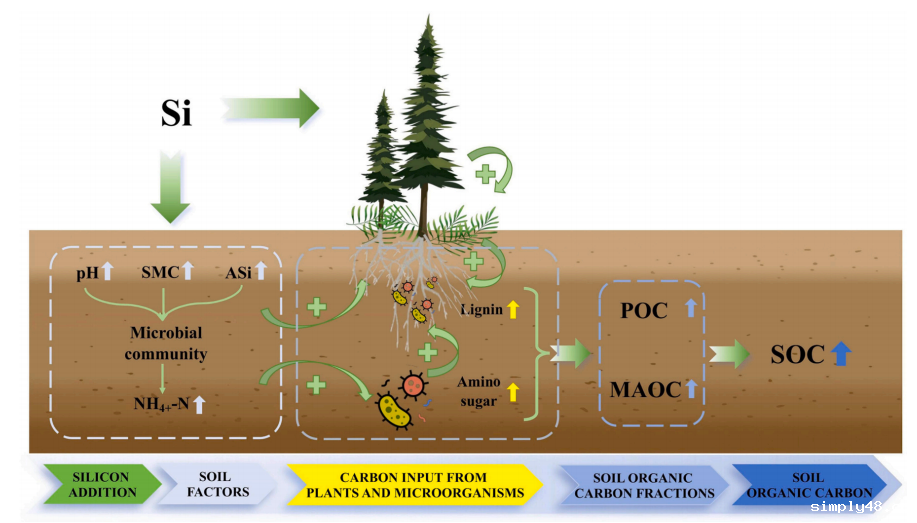 该研究在福建省顺昌县国有林场(亚热带海洋性季风气候,红壤)的杉木幼林内开展田间实验。研究结果显示,与对照相比,硅肥显著促进杉木生长。高硅处理(Si2)的生物量净增量较对照提升 1.53倍。同时显著改善土壤环境,使土壤 pH 从 4.43提升至 4.90,含水量提升 23%~27%,有效磷、铵态氮及植物可利用硅含量显著增加。在微生物层面,硅肥显著提高土壤细菌和真菌的 α 多样性(Chao1 指数),并提升绿弯菌门(Chloroflexi)、放线菌门(Actinobacteriota)及丛枝菌根真菌(球囊菌门 Glomeromycota)的相对丰度。在碳库效应上,硅肥显著提升 POC、MAOC 及总 SOC 储量,其中 POC 增幅最大(37.2%~47.8%),MAOC 增幅为 9.6%~16.2%,总 SOC 增幅为 12.0%~15.7%。此外,高硅处理显著提升土壤碳库管理指数(CMPI),表明硅肥在提升碳库质量的同时未降低其稳定性。结构方程模型进一步证实,硅有效性是核心驱动因子,通过间接促进杉木生物量积累(提升木质素输入)和微生物活性(增加氨基糖贡献),分别驱动 POC 和 MAOC 积累,最终实现 SOC 储量提升。