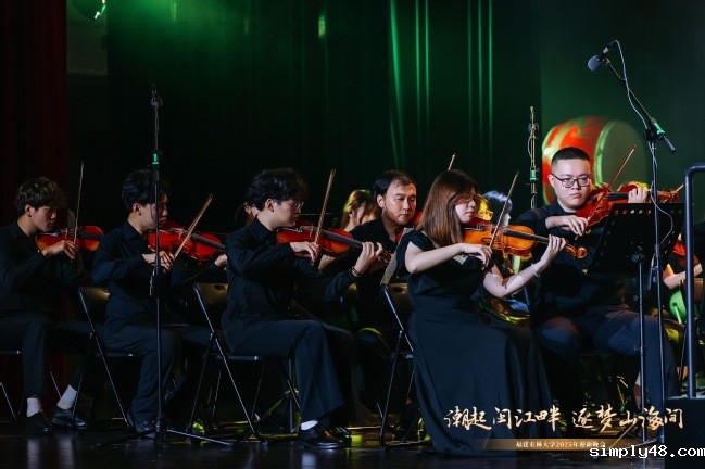 校大学生交响乐团演奏的肖斯塔科维奇的《第二圆舞曲》,悠扬的管弦乐在和谐涌动中奏响欢乐的集体共鸣,彰显福农人凝心聚力奋进国家“双一流”高校的团结力量。
