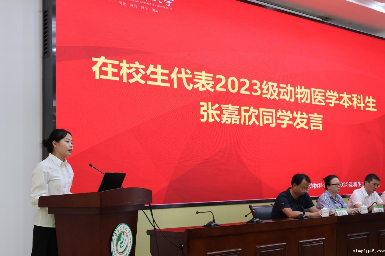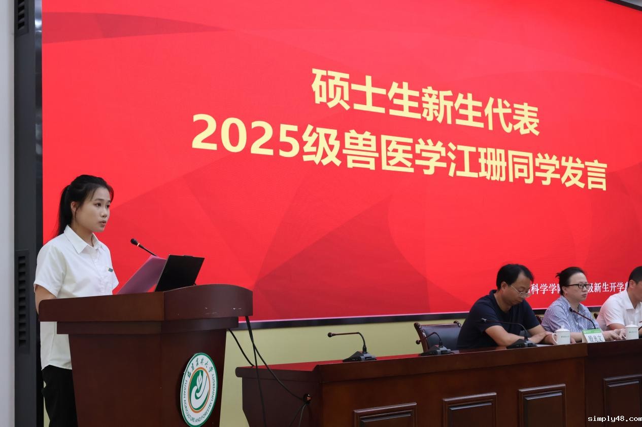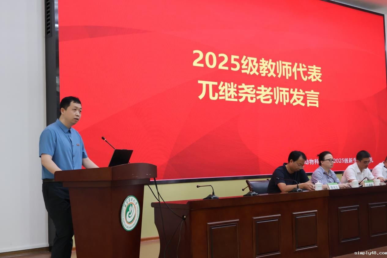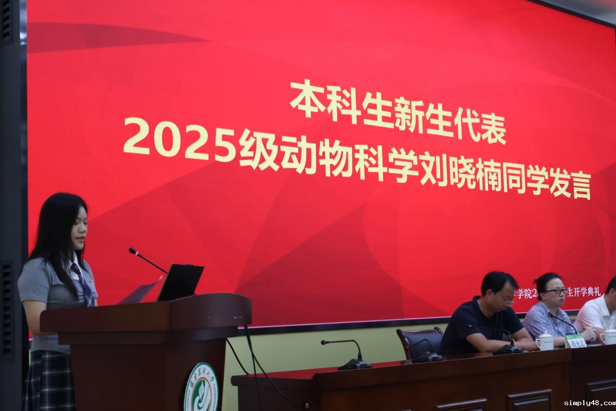 教师代表兀继尧老师分享“使命”“探索”“成长”三个关键词,鼓励学生保持好奇心、勇于探索、严谨求证;期望大家塑造人格、开阔视野,成为“知行合一”的实干家、“兼爱万物”的守护者和“胸怀天下”的担当者,在大学绽放风采,成长为推动行业健康发展的卓越人才。在校生代表2023级动物医学本科生张嘉欣同学,结合自身大学经历,阐释大学是品德修养的锤炼场、专业创新的挑战地、学以致用的舞台,鼓励学弟学妹们勇于尝试、敢于创新,书写无悔青春。新生代表2025级兽医学专业研究生江珊和2025级动物科学专业本科生刘晓楠表示将牢记校训,勤学善思,注重品德修养与专业实践,立志以所学服务社会,肩负强农兴农使命,为国家发展和民族复兴贡献青春力量。