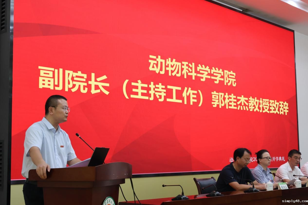 学院副院长(主持工作)郭桂杰教授致辞,他对2025级新生表示诚挚的欢迎和热烈的祝贺,同时对新生表达五点希望:一是心怀“国之大者”,树立远大理想,将个人奋斗融入时代洪流;二是恪守“学之本心”,练就过硬本领,筑牢专业基石探索未知;三是秉持“求是创新”,锤炼科学精神,敢于挑战权威追求真理;四是践行“知行合一”,深入实践一线,在广阔天地中增长才干;五是修养“仁爱之心”,敬畏生命关爱自然,塑造健全人格提升修养。希望同学们珍惜大学时光,以强农兴农为己任,成长为卓越的动科人才,为乡村振兴和农业现代化贡献智慧与力量。