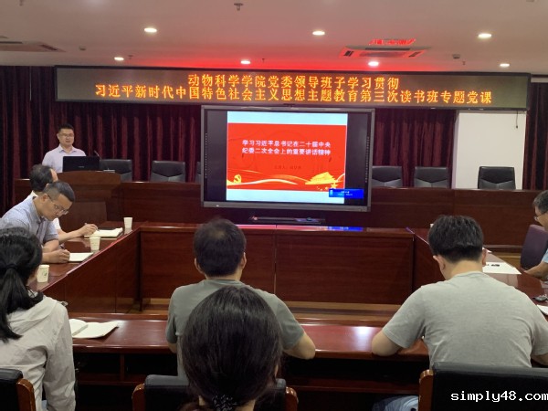 6月29日下午,动物科学学院党委领导班子在学院七层大会议室举行学习贯彻习近平新时代中国特色社会主义思想主题教育第三次读书班专题党课。院党委书记陈为德,党委副书记贺鹏,副院长苏松坤、陈大福,院纪委书记阳伏林讲专题党课。学院领导班子成员、系主任、科级干部、党支部书记和辅导员等参加。