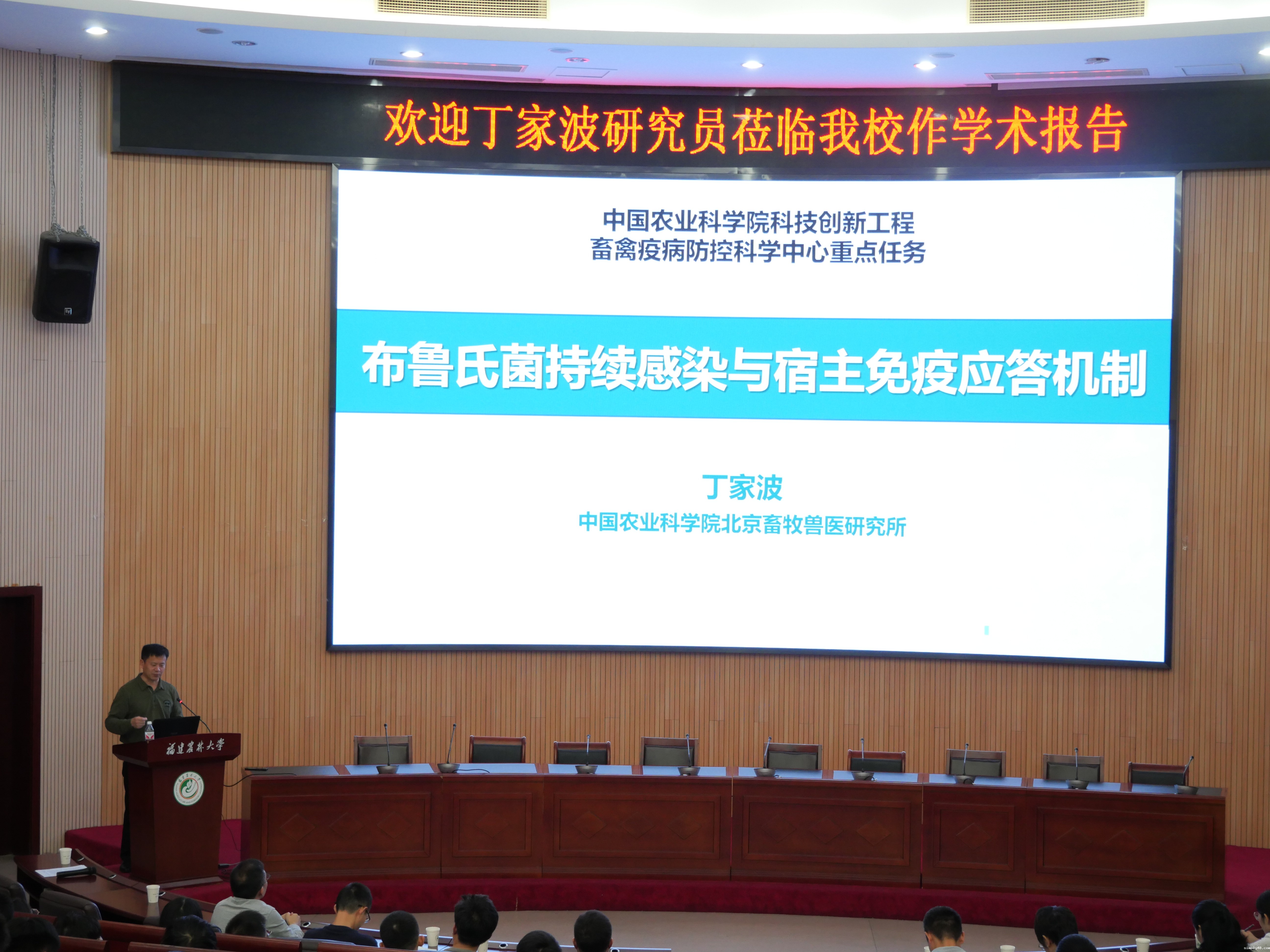 2024年11月1日,应我院邀请,中国农业科学院北京畜牧兽医研究所丁家波研究员到校进行学术交流,并为我院师生作题为《布鲁氏菌持续感染与宿主免疫应答机制》的学术报告。学术报告由动物科学学院副院长郭桂杰教授主持。