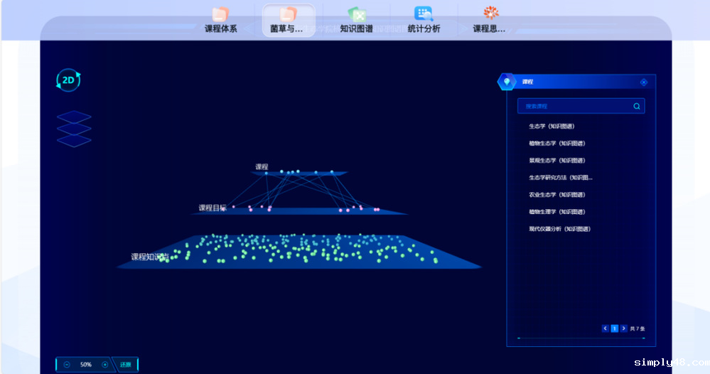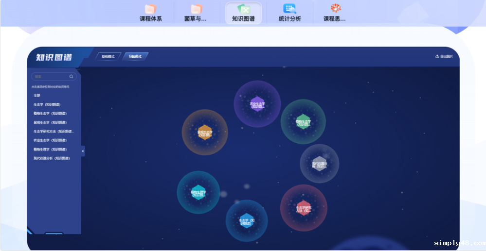 菌草与生态学院核心课程群知识图谱涵盖了7门专业基础及核心课程,1702个知识点,853个教学资源,在现有专业建设基础上,围绕“精品课程+层次”、“教学名师+示范”、“精品教材+特色”、“优势学科+平台”四种课程建设模式,将专业核心课程知识图谱进行AI分析和融合,并达到可视化呈现,使生态类课程由单一的“理学”课程,拓展为从理学基础到高新技术、从科学素养到人文精神、从理论学习到实践探究的系列课程群,从课程、师资、教材、平台建设等各方面完好地支撑了生态学创新型人才培养。