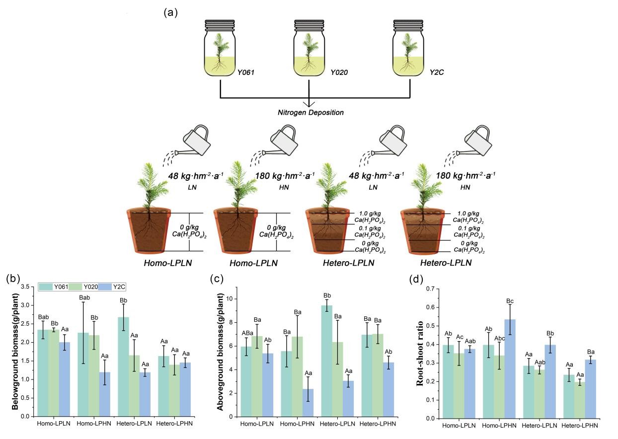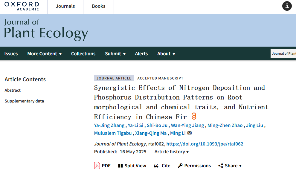 林学院李明副教授近日在林学和生态学1区TOP期刊《Journal of Plant Ecology》上发表了题为《Synergistic Effects of Nitrogen Deposition and Phosphorus Distribution Patterns on Root morphological and chemical traits,and Nutrient Efficiency in Chinese Fir》(氮沉降与磷分布互作对杉木根系形态化学特性及养分效率的调控机制)的重要学术论文。氮沉降加剧了亚热带杉木人工林的磷限制,然而不同无性系根系对异质磷环境的适应机制尚不明确。该研究通过模拟氮沉降(低N:48 kg·hm-2·a-1;高N:180 kg·hm-2·a-1)与磷空间分布格局(均质低磷 vs.异质低磷),探究三种杉木无性系的生长与代谢调控规律。