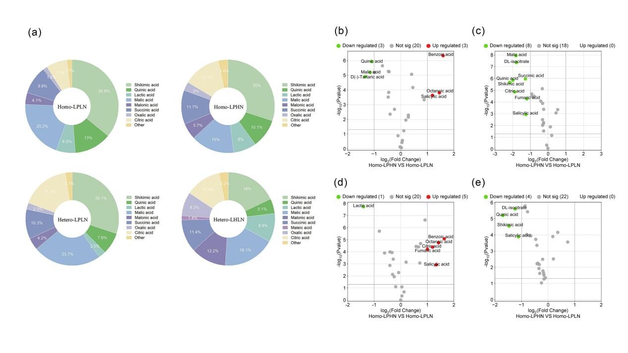 图a用不同的颜色表示特定的有机酸;图b-e显示了每种有机酸的显著差异和丰度变化,横轴表示有机酸相对丰度的对数倍变化,纵轴表示显著性水平,用对数变换的p值表示。