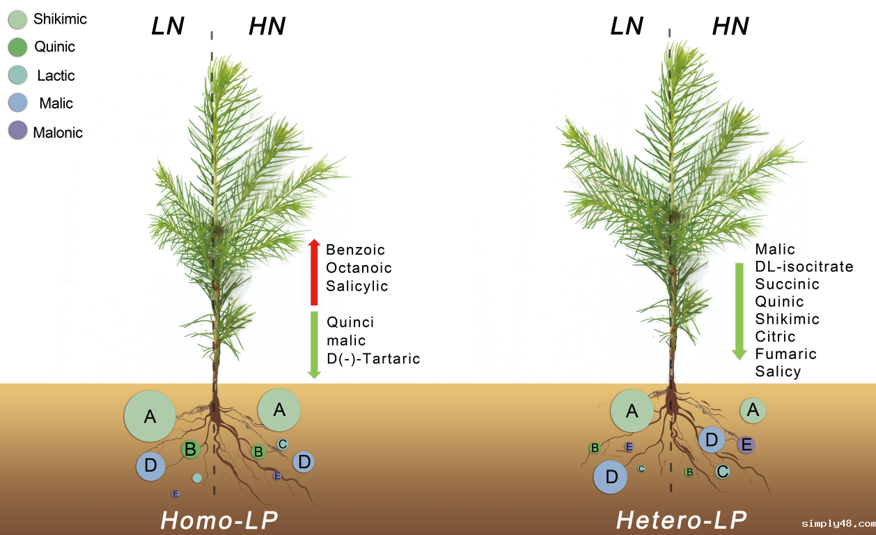 研究发现,在异质磷环境中,高氮沉降显著促进了杉木地上和地下生物量的积累,尤其是磷高效型无性系的根长和根表面积显著增加。此外,高氮沉降诱导根系酸性磷酸酶(APase)活性显著增强,但抑制了有机酸总分泌量,这一现象在均质缺磷条件下尤为明显。通过代谢组学分析,研究团队发现氮输入驱动了根系分泌物组分的重构:乳酸、丙二酸、琥珀酸和草酸占比上升,而莽草酸、奎宁酸和苹果酸减少。磷高效无性系通过根系形态可塑性(根长与表面积)实现了更高的磷吸收效率(PAE),而磷敏感型无性系则依赖酶促磷活化策略,但其生物量积累受到限制。研究还表明,氮吸收效率(NAE)在高氮条件下与PAE呈现显著协同效应。