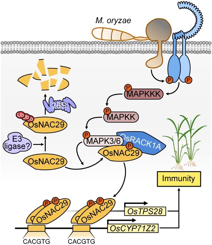 基于以上结果,作者提出OsMAPK3-OsNAC29-OsTPS28/OsCYP71Z2模块在水稻免疫中的工作模型。稻瘟菌侵染后,MAPK级联反应被激活。然后激活的OsMAPK3在Thr304处磷酸化OsNAC29,并稳定OsNAC29免受26S蛋白酶体介导的降解。OsNAC29通过直接结合OsCYP71Z2和OsTPS28的启动子并激活其转录来提高稻瘟病抗性。此外,OsRACK1A可能作为支架蛋白,招募OsMAPK3和OsNAC29形成免疫复合物。(图4)。