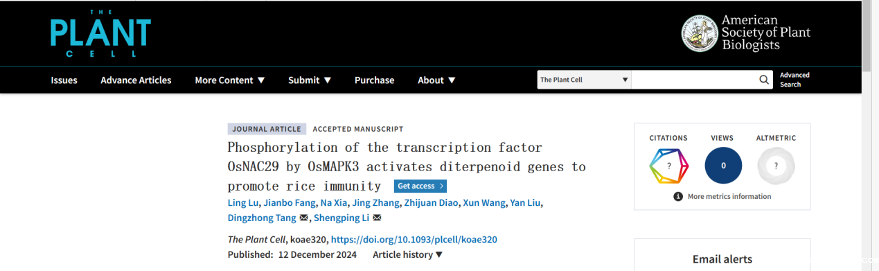 近日,《植物细胞》The Plant Cell在线发表了我院唐定中教授课题组题为“Phosphorylation of the transcription factor OsNAC29 by OsMAPK3 activates diterpenoid genes to promote rice immunity”(OsMAPK3磷酸化转录因子OsNAC29以激活二萜类合成基因的表达来促进水稻免疫)的研究论文。该项研究深入揭示了丝裂原活化蛋白激酶OsMAPK3通过磷酸化OsNAC29第304位苏氨酸以稳定其蛋白并增强其转录活性,从而促进OsNAC29对下游植保素合成基因OsTPS28和OsCYP71Z2的转录激活,进而增强水稻免疫的新机制。
