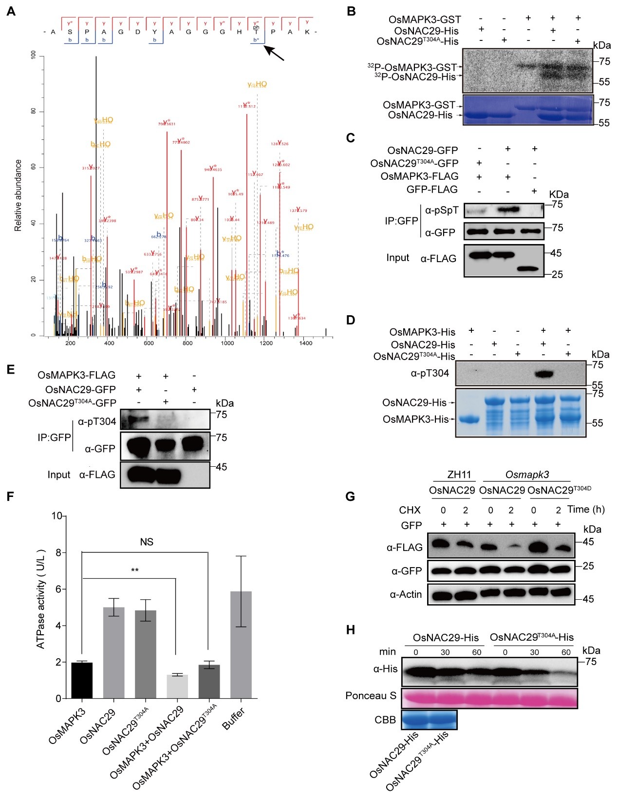 图2 OsMAPK3磷酸化OsNAC29的Thr304位点以维持OsNAC29的稳定性