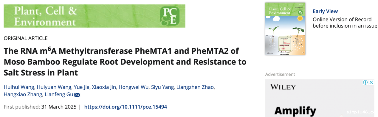 近日,我院顾连峰教授课题组在《植物细胞与环境》Plant Cell & Environment上发表了题为 “The RNA m6A methyltransferase PheMTA1 and PheMTA2 of Moso bamboo regulate root development and resistance to salt stress in plant” (毛竹m6A甲基转移酶PheMTA1与PheMTA2调节植物的根系生长与抗盐性)的研究论文,揭示了毛竹m6A甲基转移酶PheMTA1与PheMTA2对植物根系生长与抗逆能力的调控作用。