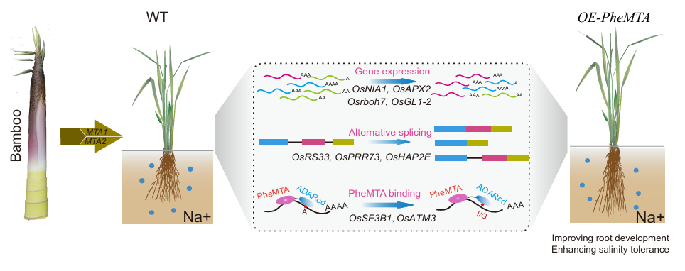 该研究将毛竹m6A甲基转移酶PheMTA1与PheMTA2,在水稻和拟南芥中进行稳定转化,发现PheMTA1与PheMTA2可以明显促进水稻与拟南芥的根部发育,并提高它们的抗盐能力。随后基于Hyper TRIBE方法,揭示了PheMTA1与PheMTA2结合抗逆相关基因的转录本,在PheMTA1与PheMTA2的诱导下,这些靶标RNA在基因表达水平与选择性剪接上均发生了差异变化(图1)。该研究揭示了毛竹m6A甲基转移酶的功能,为后续禾本科植物的遗传改良奠定了理论基础。