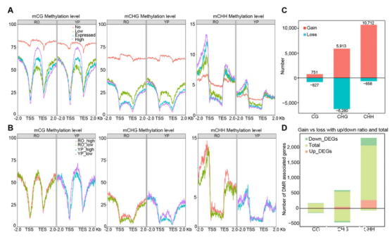 2. CHH甲基化在根启动子区整体高于幼穗,并与根特异性表达基因的转录相关。相比幼穗(YP),根(RO)存在大量CHH高水平甲基化区间。