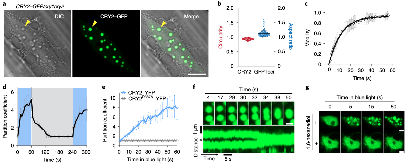 光是调控生物体内基因表达与昼夜节律的重要环境因子,但是光如何影响RNA代谢并不清楚。该研究首先通过m6A-seq发现,蓝光诱导拟南芥转录组m6A甲基化,而蓝光受体突变体cry1cry2缺乏蓝光反应,特别是生物钟相关基因的m6A甲基化水平在cry1cry2突变体中的降低尤为明显。随后,研究者通过体内体外实验证明了CRY2和m6A“编码器”(writer)复合体(MTA/MTB/FIP37)之间的相互作用,但是令人惊讶的是蓝光受体与编码器之间的亲和性并不具有通常所见的光诱导变化现象。进一步研究表明,CRY2在蓝光下发生液-液相分离(Liquid-liquid Phase Separation) 从而形成光小体(photobody),并募集“m6A编码器”复合体至光小体中,这一现象表明蓝光所致的CRY2相分离能够提高m6A“编码器”复合体在光小体中的浓度,促进RNA甲基化的发生,进而调节植物体内mRNA的代谢和稳态。随后研究发现cry1cry2和mta突变体都表现出生物钟节律周期变长的表型,且生物钟核心组分CCA1 mRNA蓝光下甲基化水平在cry1cry2和mta突变体中均明显降低。RNA降解实验结果显示cry1cry2和mta突变体中CCA1 mRNA 在蓝光下降解速率较野生型显著变慢,进一步证明了CRY2通过影响m6A“编码器”复合体在蓝光下的活性来调节植物生物钟节律。