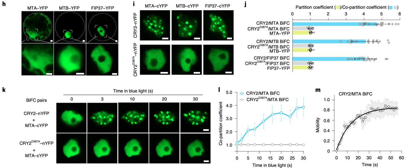 图2. CRY2-MTA在蓝光下发生相分离并招募m6A“编码器”复合体。