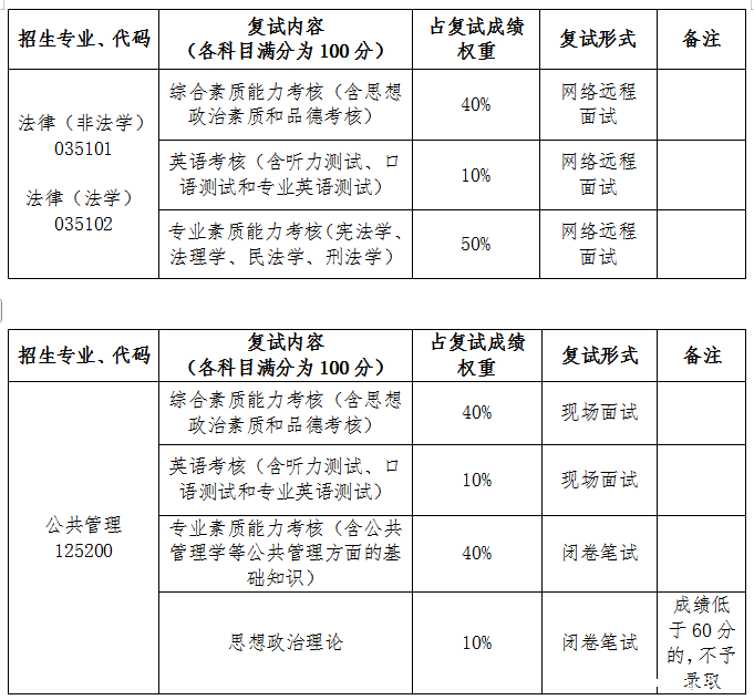 注: 1.复试考核内容说明 (1)专业素质能力考核。主要考查内容包括:创新精神和能力;在本专业的发展潜力以及对本学科发展动态的了解;运用本学科知识发现、分析和解决问题的能力。 (2)综合素质能力考核。主要考查内容包括:本学科以外的学习、科研、社会实践或实际工作表现等情况;事业心、责任感、纪律性、协作性和心理健康情况;人文素养;行为举止、表达和礼仪等。 (3)英语考核。主要考查内容包括:英语听力测试、英语口语测试和专业英语测试等。 (4)思想政治素质和品德考核。主要考查内容包括:考生的政治态度、思想表现、道德品质、遵纪守法、诚实守信等方面。必要时可采取“函调”或“派人外调”的方式对考生的思想政治素质和品德考核。 (5)身体素质考核。今年复试期间暂不进行体检,考生须提交近半年内二甲(含二甲)及以上医院的体检报告,考生入学后还需统一进行体检,体检不合格者将取消学籍。 2.所有同等学力考生都须加试2门所报考专业本科主干课程,且与初试科目不同。加试采用笔试的方式进行,每门课程满分为100分,考试时间为3小时。加试科目成绩不计入总成绩,但任一门加试科目成绩低于60分的,则视为复试不合格,不予录取。 3.复试成绩为复试各方式考核成绩之和,保留小数点后三位(四舍五入),以100分为满分,60分为合格。复试成绩不合格者不予录取。 (二)复试资格审查 1.学院在复试前对考生进行资格审查。凡未进行资格审查或资格审查未通过的考生一律不予复试。 2.复试资格审查材料及上交时间: (1)参加现场复试的考生于复试报到时上交资格审查材料。 (2)参加网络远程复试的考生最迟于复试前一天,将资格审查材料扫描件,合并在一份PDF文件中,发送到邮箱fafuggyzb@163.com,文件名:资格审查+报考专业+姓名+联系电话。 3.考生因特殊原因不能在规定时间内提交资格审查材料,须提交“2025年全国硕士研究生招生考试预复试承诺书”(见附件)。 4.考生应提交以下资格审查材料: (1)考生签订的《硕士研究生招生复试考生诚信承诺书》(见附件。网络远程复试考生在系统上进行确认,无须提交此项材料)。 (2)《米兰国际体育俱乐部官网报考硕士研究生现实表现情况表》(见附件。该表由考生档案所在单位填写并盖章;若考生档案由工作单位寄挂在人才市场,则由考生档案所在地填写并盖章;本校应届毕业生由本科就读学院审查填写并盖章)。 (3)准考证(可在报考系统下载)、身份证原件及复印件(考生本人签名确认); (4)本科毕业证书或学生证(应届生)或大专毕业证书(同等学力考生)或本科结业证书(同等学力考生)。同等学力考生还须提交6门(含)以上与所报考专业相关的本科专业课程成绩证明(由校级教务部门出具)和英语合格材料(详见我校发布的《米兰国际体育俱乐部官网2025年硕士研究生招生简章》)。 (5)在读自学考试和网络教育本科生,录取当年入学前(具体时间以我校当年入学报到时间为准,下同)须取得国家承认的本科毕业证书,否则录取资格无效。 (6)有关学历认证报告,即教育部学历证书电子注册备案表、中国高等教育学历认证报告或教育部留学服务中心出具的《国(境)外学历学位认证书》,应确保至今年5月份录取校验期间仍在有效期。 ①考生可登录中国高等教育学生信息网(学信网)(http://www.chsi.com.cn)进行在线学历验证,下载并打印“教育部学历证书电子注册备案表”; ②无法进行在线学历验证的考生,可向相关学历认证机构申请学历认证,获取“中国高等教育学历认证报告”。如果资格审查时,学历认证报告还在办理中,须提供申请办理时认证机构出具的收费凭据原件及复印件,并提供本人签字的承诺书; ③境外学历者,提供教育部留学服务中心出具的《国(境)外学历学位认证书》; (7)专项计划材料。“少数民族高层次骨干人才计划”专项考生除提供(1)-(6)项材料外,还应提供《2025年少数民族高层次骨干人才计划考生登记表》或相关证明材料。“退役大学生士兵计划”专项考生除提供(1)-(6)项材料外,还应提供《男(女)性应征公民入伍批准书》《义务兵(士官)退出现役证》。 (8)考生近半年内二甲(含二甲)及以上医院的体检报告。 (三)第一志愿考生复试 1.第一志愿考生的复试工作于2025年4月7日前结束。第一志愿复试考生名单、复试时间见学院官网公布。 2.关于“少数民族高层次骨干人才计划”“退役大学生士兵计划”等专项计划、享受初试加分或照顾政策考生的相关情况,学院会进行备注说明。享受初试加分的考生须在规定时间内向学院提交证明材料和加分申请书,经审核验证符合加分政策才能予以加分,逾期不提供的视为自动放弃。加分对象主要为参加“大学生志愿服务西部计划”“三支一扶计划”“农村义务教育阶段学校教师特设岗位计划”“国际中文教育志愿者”等项目服务期满、考核合格后3年内参加全国硕士研究生招生考试的考生。 (四)调剂考生复试 1.若招生专业有调剂名额,学院将在全国硕士生招生调剂服务系统2025年4月8日开通后,根据实际情况开展一次或若干批次调剂复试工作。每次开放调剂系统持续时间不短于12个小时,不长于36个小时。所有调剂考生的复试工作一般于4月25日前结束。 学院将在调剂考生复试前发布调剂公告,具体调剂时间及调剂人数、比例等详见学院官网公告。 2.调剂考生须登录