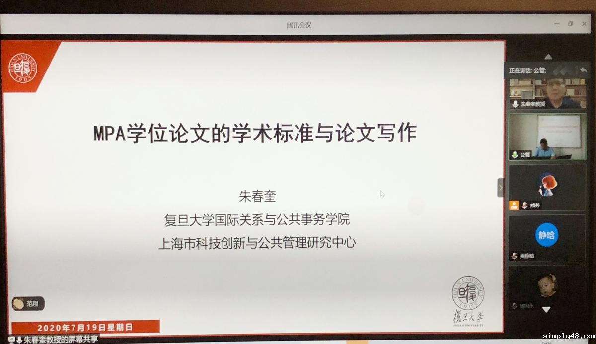 7月19日上午,公共管理学院依托腾讯会议平台举行了2020年研究生导师培训班第五专题辅导报告暨第122期海峡公管讲坛,第四届全国MPA教育指导委员会委员,中国管理现代化研究会公共管理专业委员会副理事长、复旦大学国际关系与公共事务学院博士生导师朱春奎教授应邀做了题为“MPA学位论文的学术标准与论文写作”的学术讲座。管理学院院长苏时鹏主持讲座,学院全体研究生导师和部分研究生共200多人在线聆听了本次讲座。