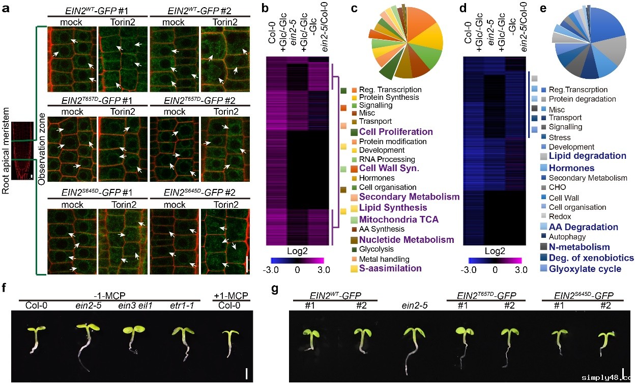 图2. 葡萄糖-TOR-EIN2调控基因转录组重编程,促进根尖快速生长