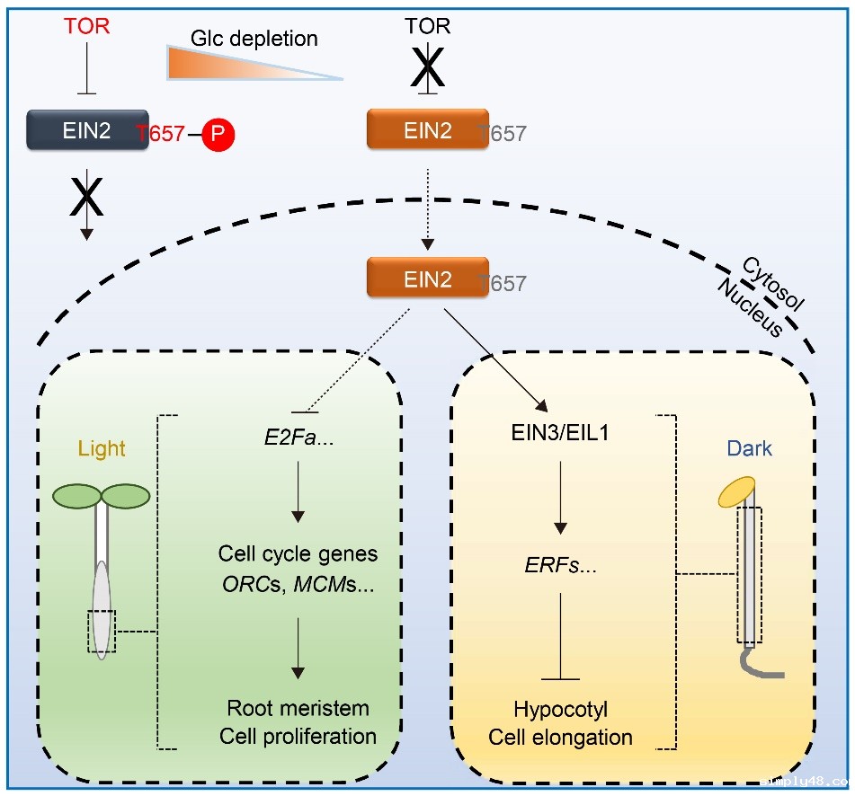 图3. 葡萄糖-TOR-EIN2通路调节下胚轴以及根的生长的工作模型。
