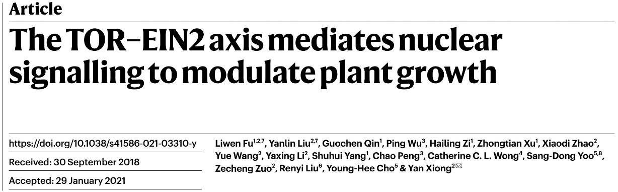 近日,我们团队付力文副教授、刘岩林副教授等在Nature在线发表了题为The TOR–EIN2 axis mediates nuclear signalling to modulate plant growth的研究论文,该研究发现乙烯信号通路中的关键蛋白EIN2是糖-TOR信号通路调控基因转录组重编程的重要下游元件。TOR直接磷酸化EIN2并抑制EIN2全长蛋白的质-核穿梭,阻止EIN2在细胞核内抑制细胞分裂和伸长相关基因的表达,从而促进植物细胞的分裂和伸长。令人惊奇的是,该研究发现EIN2参与糖-TOR信号通路与其参与传统的乙烯-CTR1信号通路是相分开的,首次揭示了EIN2 独立于乙烯信号通路的新分子机制和功能。