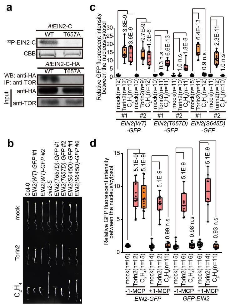 图1. TOR激酶磷酸化EIN2-Thr657位点,抑制EIN2全长蛋白的质-核穿梭