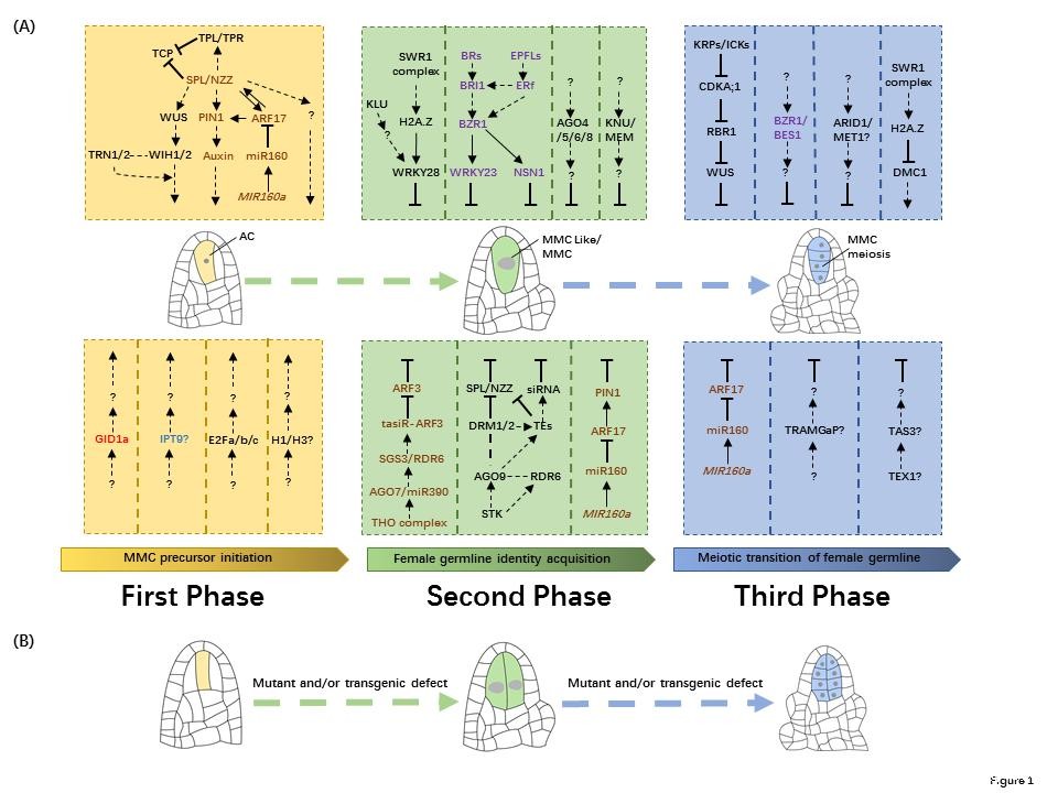 图1. 拟南芥MMC发育的三个阶段及其调控基因网络。