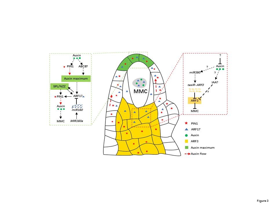 图3. 生长素在胚珠原基中的分布和生长素信号调控MMC发育基因网络。