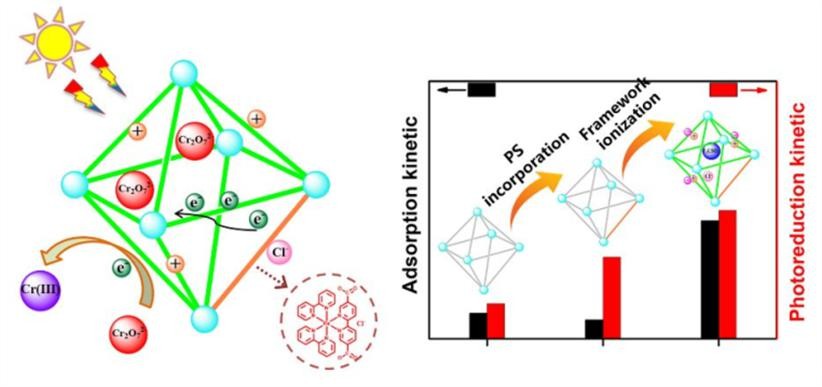 可见光催化还原Cr(VI)是一种非常有前途的Cr(VI)污染处理的方法,Cr(VI)在光催化剂表面/孔道内的传质过程会影响其还原效率,但目前开发的光催化剂通常只注重半导体本身性质如可见光吸光度和能量的调节,而忽视Cr(VI)的吸附和传质过程。本工作通过引入光敏剂调节MOFs材料的带隙和框架的离子提高底物的传质速率,该策略能够有效地提高催化剂光还原Cr(VI)的活性。