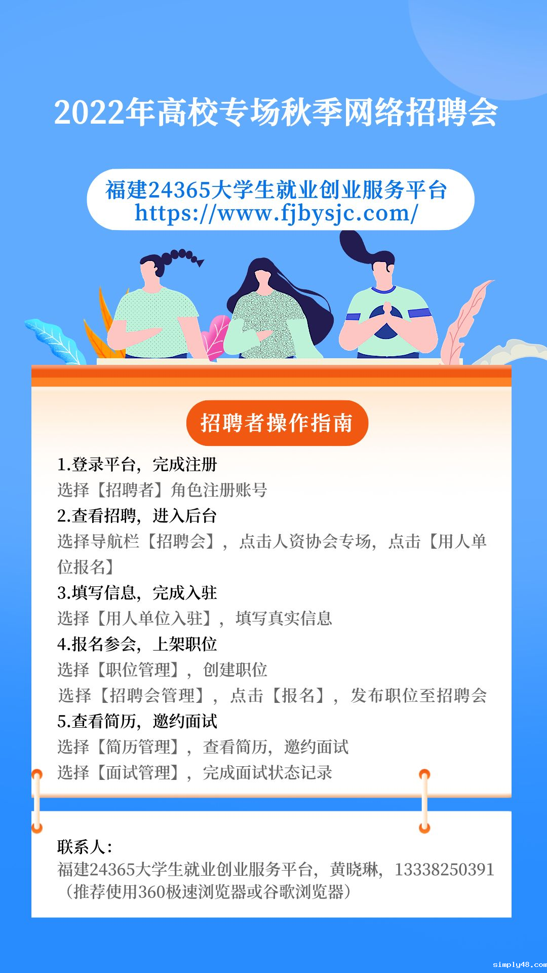(一)为实现人岗匹配、精准推送,各用人单位请登录“福建24365大学生就业创业服务平台”(https://www.fjbysjc.com),根据网络招聘操作指南(下图)报名参会、发布职位。