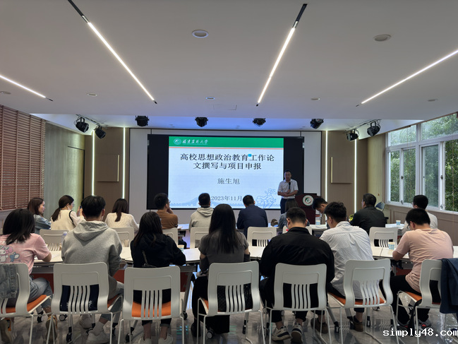 施生旭教授从“论文写作要点”“报刊文章投稿思路”“项目申报体会”“近年来省部级以上思政教育工作精品项目选题概况”等四个方面,结合具体申报案例与自身学术经历,生动详实地对论文写作与项目申报流程与技巧作分析讲解,并勉励与会辅导员敢于尝试、善于积累、借力发力、积极交流,不断提升学术研究能力和论文写作水平。讲座深入浅出、内容丰富,语言生动、针对性强,为辅导员如何结合实际工作撰写思政论文、开展项目申报拓宽了思路。