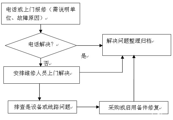 1.值班人员接受用户电话或上门报修后,若能通过电话或口头描述解决问题,则立即解决;若需上门解决,上午报修可在当天上门,下午报修根据实际维护量,可能安排次日上门;