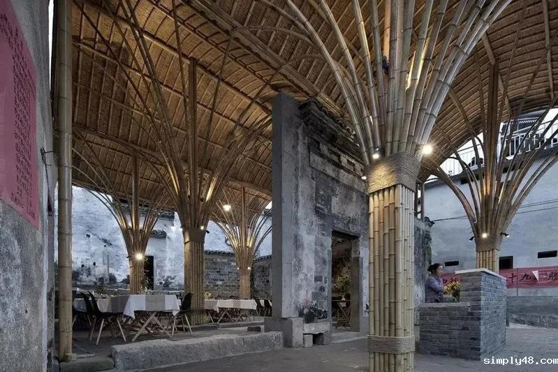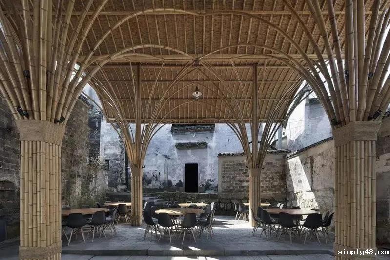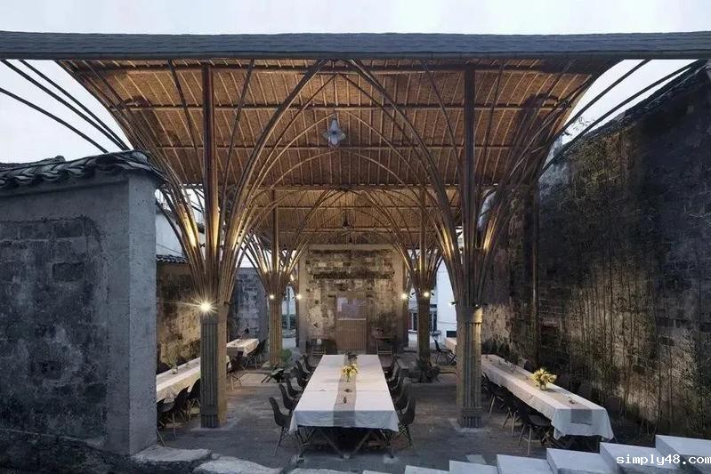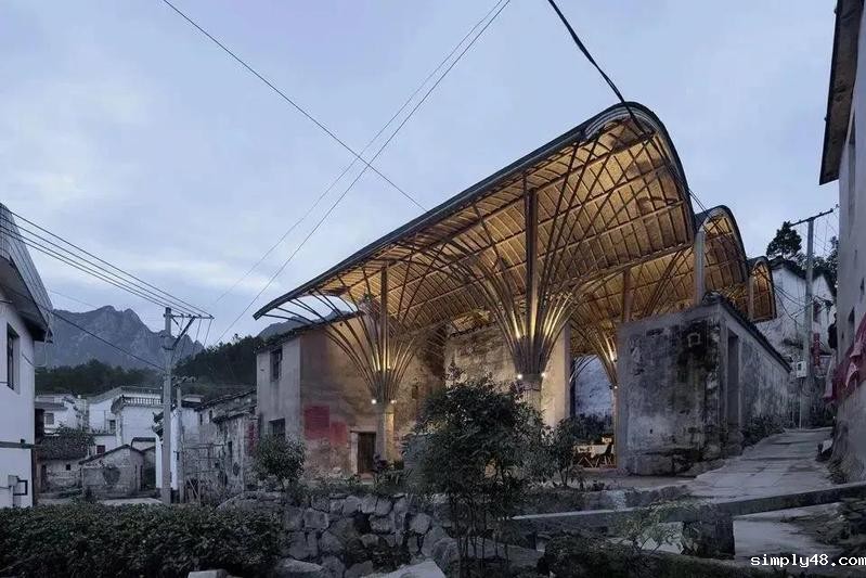 项目基址位于尚村前街的高家老屋。因年久失修,老屋主体已坍塌, 仅留有部分外墙与老屋室内及天井的台基地面。本项目是将高家老宅废弃坍塌院落激活并加以利用,变废为宝,用6把竹伞撑起的拱顶覆盖的空间,为村民和游客提供休憩聊天,娱乐聚会的公共空间,兼备村民集会活动、村庄历史文化展厅的功能。