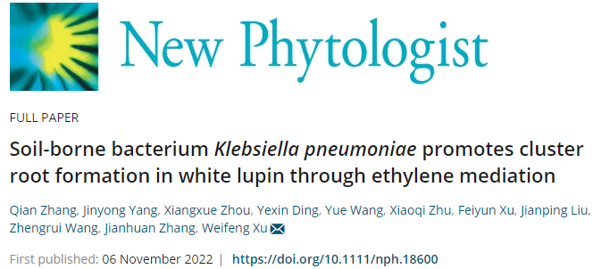 在《New Phytologist》发表题为“Soil-borne bacterium Klebsiella pneumoniae promotes cluster root formation in white lupin through ethylene mediation”的研究论文。本研究结合大数据分析,首先解析了白羽扇豆根际、根鞘、根内和叶片微生物的群落特征,发现在低磷条件下变形菌门的细菌被逐渐从根际富集到排根内,表明其对低磷条件下排根的形成可能有重要作用。深入研究表明:变形菌门的Klebsiella pneumoniae (P7菌)具有最高的ACC脱氨酶活性(ACCD,该酶可以降解植物源的乙烯前体ACC,进而阻碍植物乙烯合成与积累);变形菌门细菌P7通过ACCD酶抑制根内ACC的含量进而促进排根的产生;P7菌-乙烯介导的排根形成与低磷条件下排根形成区生长素的积累有关。以上研究为作物根系-微生物-土壤协同高效利用土壤磷素提供了重要调控依据。