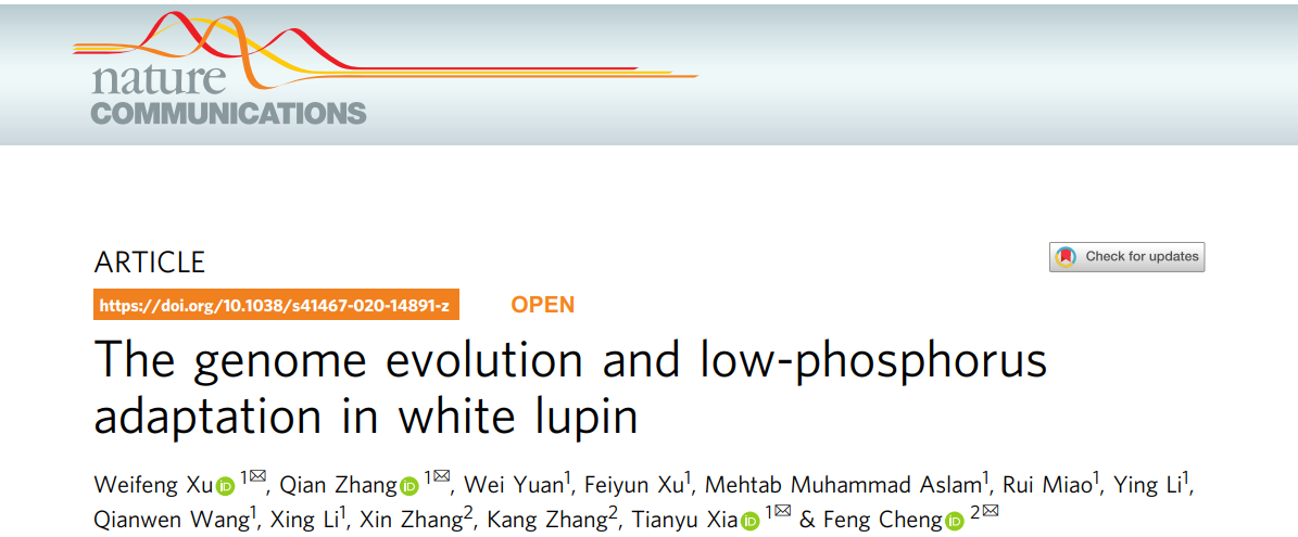 在《Nature Communications》上在线发表题为“The genome evolution and low-phosphorus adaptation in white lupin”的研究论文,揭示了白羽扇豆中的亚基因组优势现象,发现低磷适应特性与相关调控通路基因的大规模扩张密切相关。