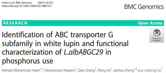 在《BMC Genomics》上在线发表题为“Identification of ABC transporter G subfamily in white lupin and functional characterization of L.albABGC29 in phosphorus use”的研究论文,发现该ABCG29基因有利用低磷条件下植物生长和对磷的吸收,表明ABCG29对白羽扇豆磷高效具有重要作用。