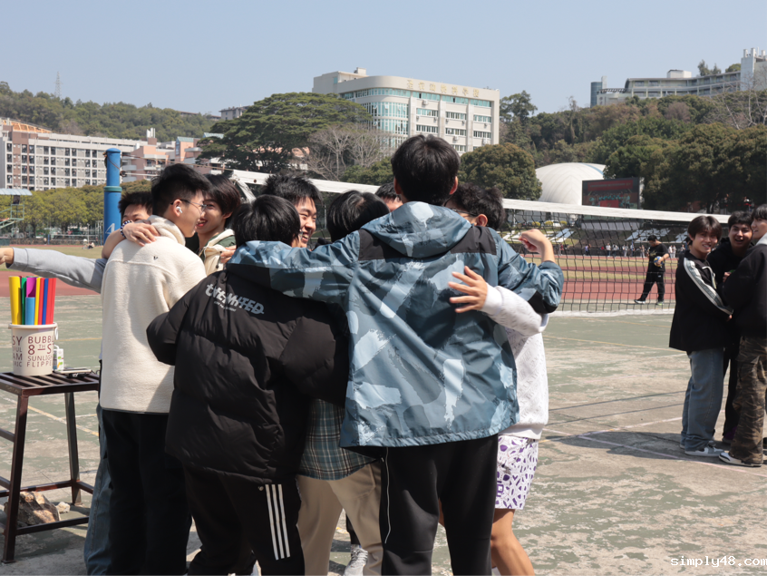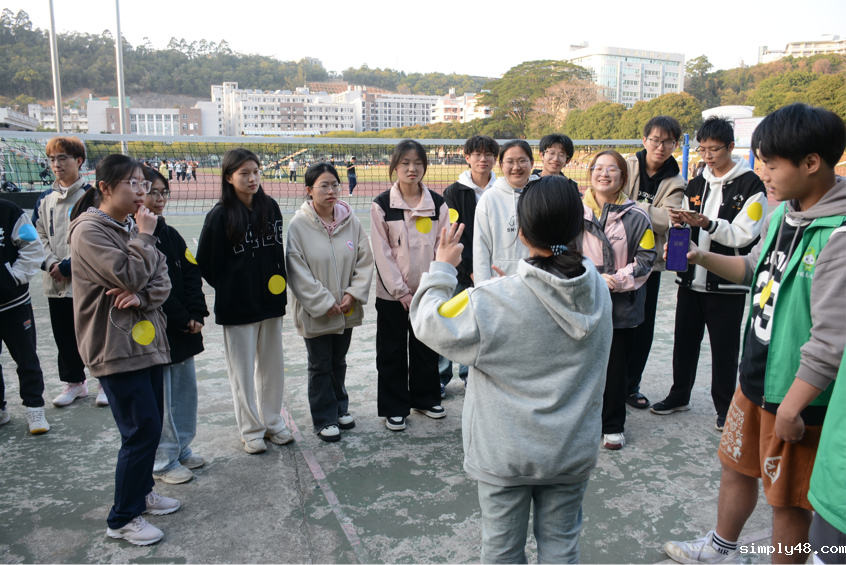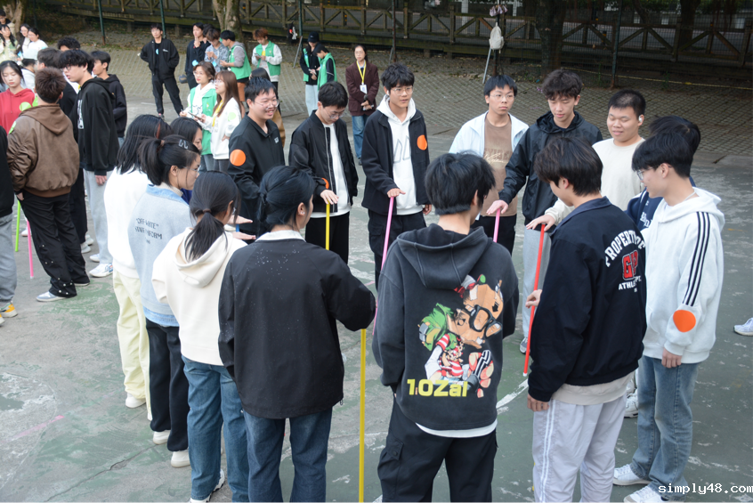 “不倒森林”比赛同样紧张激烈。每组同学围成紧密圆圈,按顺时针方向迅速移动脚步,精准完成杆的交接。每一次交接都承载着队友间的信任,即使出现失误,同学们也能迅速调整。完成比赛后的喜悦,是团队精神的完美呈现。