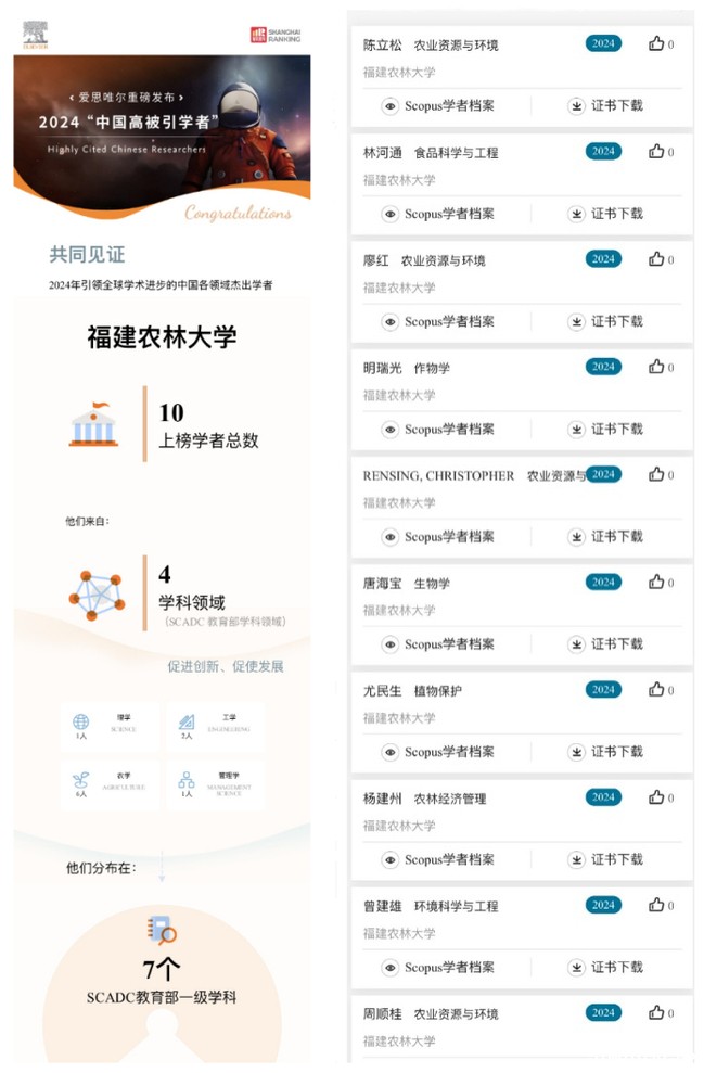 2025年3月25日,爱思唯尔 (Elsevier) 重磅发布2024“中国高被引学者” (Highly Cited Chinese Researchers) 榜单。此榜单以全球权威的引文与索引数据库Scopus作为中国学者科研成果的统计来源,采用上海软科教育信息咨询有限公司开发的方法,并受到国内外众多媒体和学者的高度关注。我院有5位教授上榜(全校10人),分别是农业资源与环境学科周顺桂、廖红、陈立松、CHRIS,以及环境科学与工程学科曾建雄,其中曾建雄教授是福建省高校在环境科学与工程领域的唯一入选者。