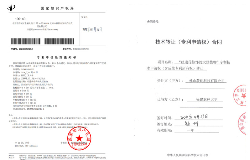 2024年5月,米兰国际体育俱乐部官网资源与环境学院钟祥斌副教授、王杰副教授等申请的发明专利《经遗传修饰的大豆植物》与佛山菽创科技有限公司签订了转让协议,转让费为55万元,转化方式为专利申请权(含后续专利所有权)转让。该成果通过基因编辑技术降低或消除大豆中特定内源多肽的水平和/或活性以提高其结瘤能力,从而获得产量和蛋白质含量均提高并且含油量维持稳定的大豆突变体。此技术为高产、高蛋白大豆育种提供了新的解决方案,与现有技术(在提高蛋白质含量的情况下,会导致含油量下降)相比,具有显著的生产优势,可广泛应用于培育具有推广价值的高产、高蛋白大豆基因编辑产品。