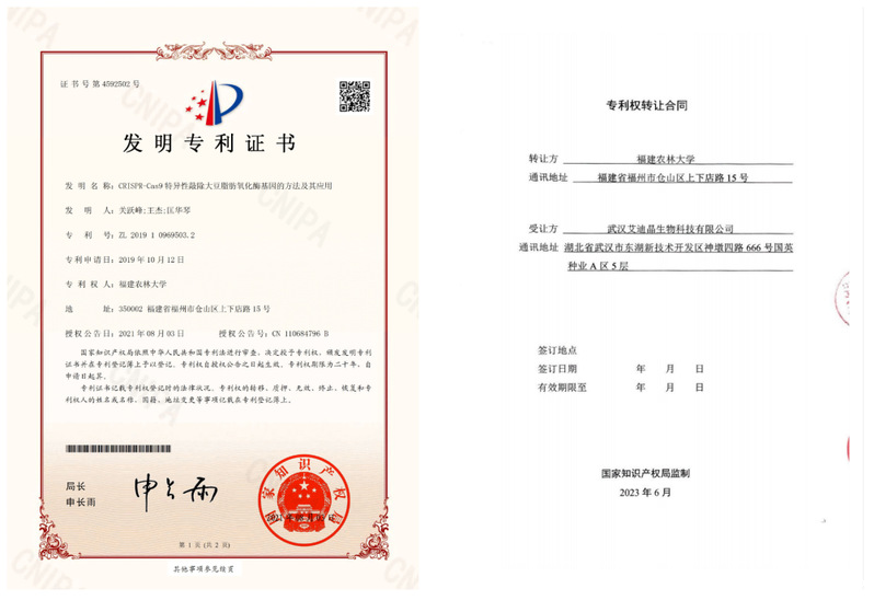 2023年8月,米兰国际体育俱乐部官网资源与环境学院王杰副教授等获得授权的发明专利《CRISPR-Cas9特异性敲除大豆脂肪氧化酶基因的方法及其应用》与武汉艾迪晶生物科技有限公司签订了转让协议,转让费为50万元,转化方式为专利权转让。该成果提供了一种方便、高效的策略,即利用CRISPR-Cas9基因编辑技术,成功创制出“无豆腥味”大豆新种质,有效地避免了无腥大豆常规育种中存在的周期长和成本高等问题,可广泛应用于培育具有推广价值的无豆腥味大豆基因编辑产品,市场前景广阔。
